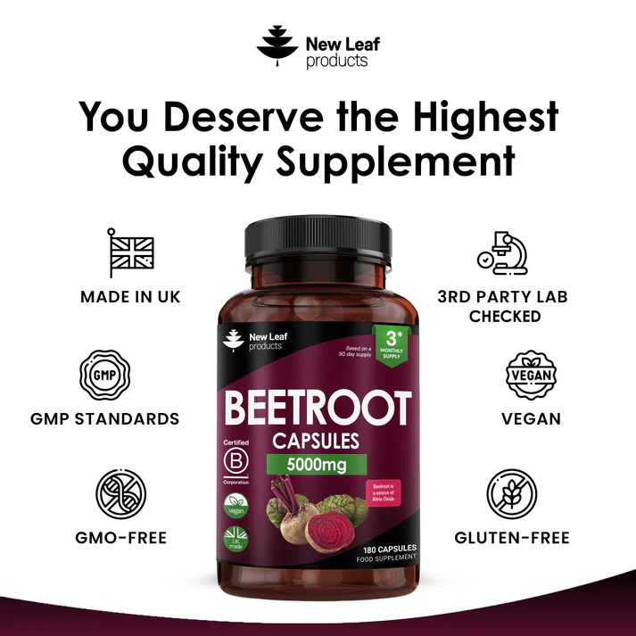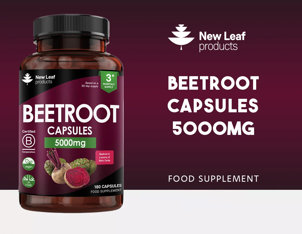 New Leaf’s Beetroot Capsules deliver 5000mg per serving, combining Beetroot Extract and Beetroot Powder for a potent and balanced formulation. It is naturally rich in vitamins and minerals such as vitamin C, iron, potassium, and folate. Beetroot is a nutrient-dense vegetable valued for its role in traditional and modern diets. Enhanced with black pepper for improved absorption, this supplement provides a convenient three-month supply with 180 capsules.
