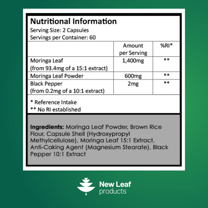 Moringa Leaf Powder, Brown Rice Flour, Capsule Shell (Hydroxypropyl Methylcellulose), Moringa Leaf 15:1 Extract, Anti-Caking Agent (Magnesium Stearate), Black Pepper 10:1 Extract
