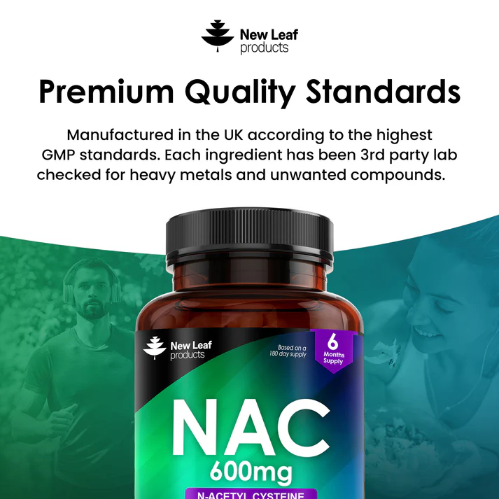 Our NAC Capsules are meticulously crafted to provide a high-quality and potent source of this important amino acid. By stimulating glutathione biosynthesis, NAC may contribute to overall health and wellness. With our 6-month supply of 600mg capsules, you can feel confident in providing your body with the necessary NAC it needs to thrive. Elevate your well-being with N-Acetyl Cysteine whilst promoting a healthier & more balanced lifestyle with New Leaf’s NAC Supplements.